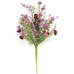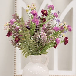 The Blushing Spring Blossoms Bush brings a colorful, nature-inspired accent to decorative springtime displays. The bush features a green-wrapped stem and is adorned with a wide array of textures. Green plastic branches sprout soft faux florals in shades of white, purple, and burgundy with green or yellow centers. Foam berries in shades of purple accent the bush along with dimensional eucalyptus and fern leaves. Measures 20” high by 9” wide by 5” deep.