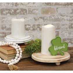 The Distressed Whitewashed Risers are a set of two round wooden risers with a distressed, rustic finish. The risers have round wooden feet and a flat surface, making them perfect for holding a candle, quote block, florals, or other everyday tabletop décor. The small riser has a white finish and measures 1.5” high and 6” in diameter. The large riser has a natural wood finish and measures 1.5” high and 8” in diameter.