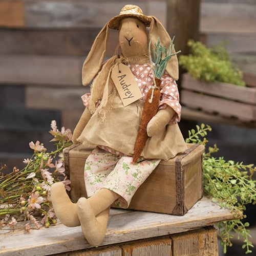 The Audrey Bunny Doll is a decorative plush bunny figurine made of grungy ivory linen fabric. The bunny wears a pink patterned top and floral pants, along with a farmer’s hat, and is accessorized with a cheesecloth scarf, carrot plush, and paper tag reading “Audrey”. Display this bunny sitting on a shelf or riser to bring a rustic, charming touch to the home during the spring and Easter season. Measures 17” high by 7” wide by 2.5” deep.