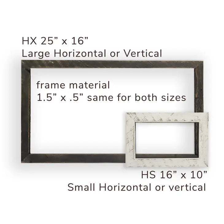 This framed print on permanently mounted hardboard is from an original by Steve Montes. The frame is made from reclaimed barns from New York. It is made entirely from scratch, including the frame, Each frame will have 2 loops and a hanging wire to hang it with.