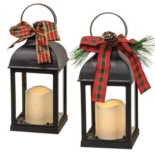 The Black Holiday Lanterns are an assortment of two small square lanterns made of black plastic with clear window panels. The lanterns each house a white pillar candle for a cozy, ambient effect, powered by 2-AAA batteries (not included) with an optional timer function. The top of the lanterns each have a round handle, adorned with either a festive gold plaid ribbon or a festive checkered ribbon with a pine bough and pinecone. Each lantern measures 10” high and 3.75” by 3.75”.