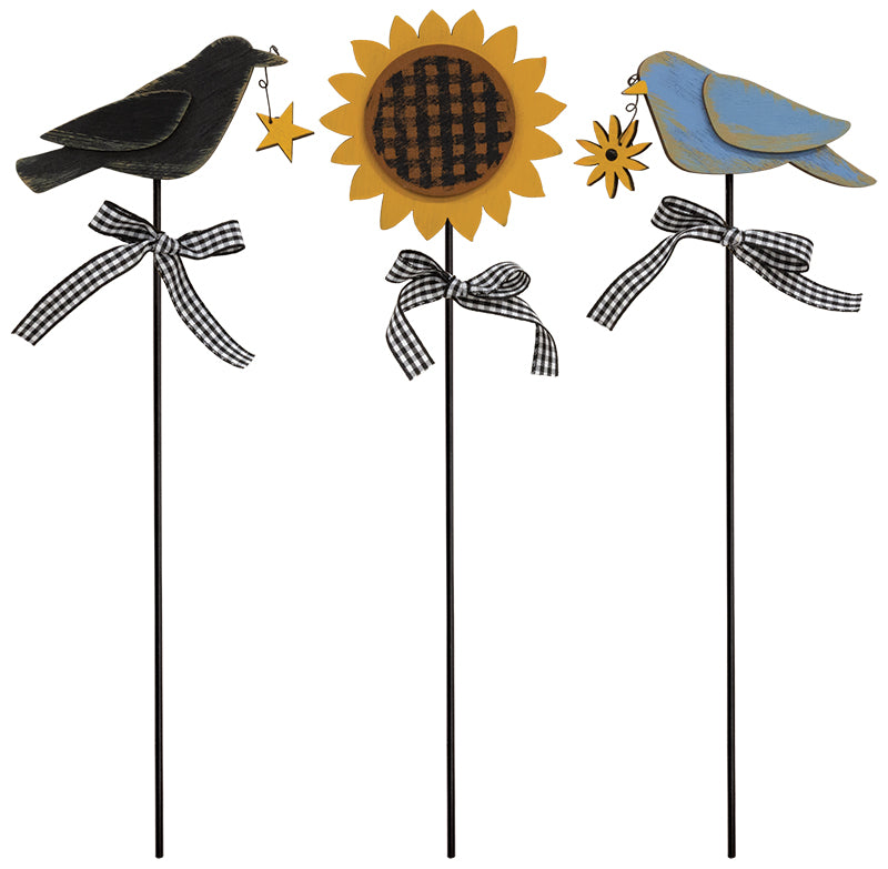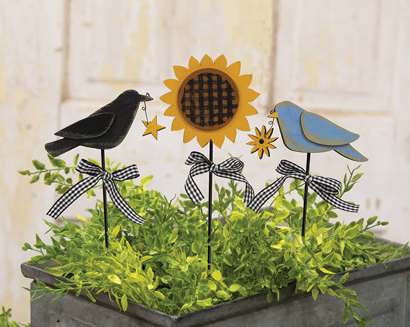 Enhance your floral displays, potted plants, and canisters with the rustic elegance of our Bluebird, Crow & Sunflower Plant Pokes. Made of layered wood and adorned with gingham bows, these pokes feature a distressed, primitive look. The crow boasts a dangling star accent while the bluebird holds a vibrant yellow flower. The sunflower's center is embellished with a charming gingham pattern. Measuring 12" tall, these pokes add a touch of sophistication to any space. Crafted from wood and metal, with individual dimensions of 2" H x 4" W x 0.25" D, 3.5" Dia. x 0.25" D, and 1.75" H x 4" W x 0.25" D, respectively.