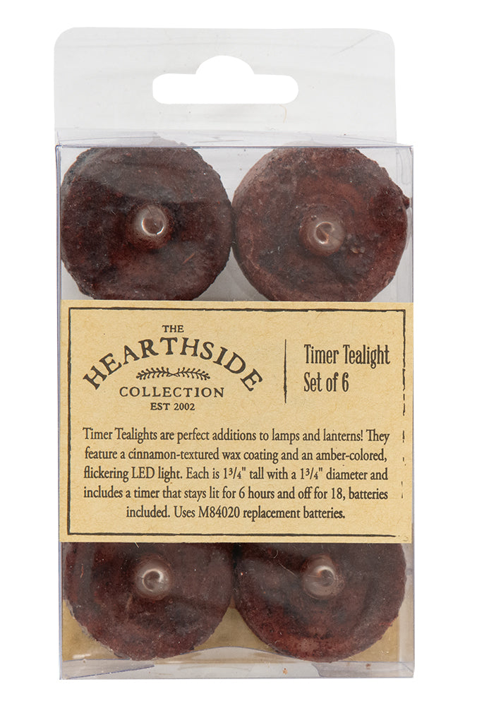 Our popular timer tealights in our Burnt Burgundy color of burgundy with a dark burgundy grungy coating, bundled in a set of 6. Tealights are battery-operated and feature a built-in timer that runs for 6 hours then turns off for 18 hours. They look great on trays, tabletops, or windowsills and come pre-installed with AG13 button batteries.