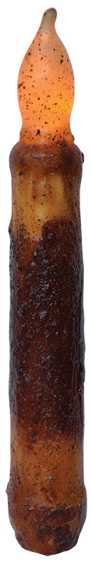 Battery operated 6" taper with a rough textured wax coating and flame shaped tip offers a softly flickering candescent glow. Goes on with a twist of the bottom and stays on for 6 hours and then off for 18 hours. This repeats daily at the same time. To reset the time, simply turn off and turn back on at the desired time.