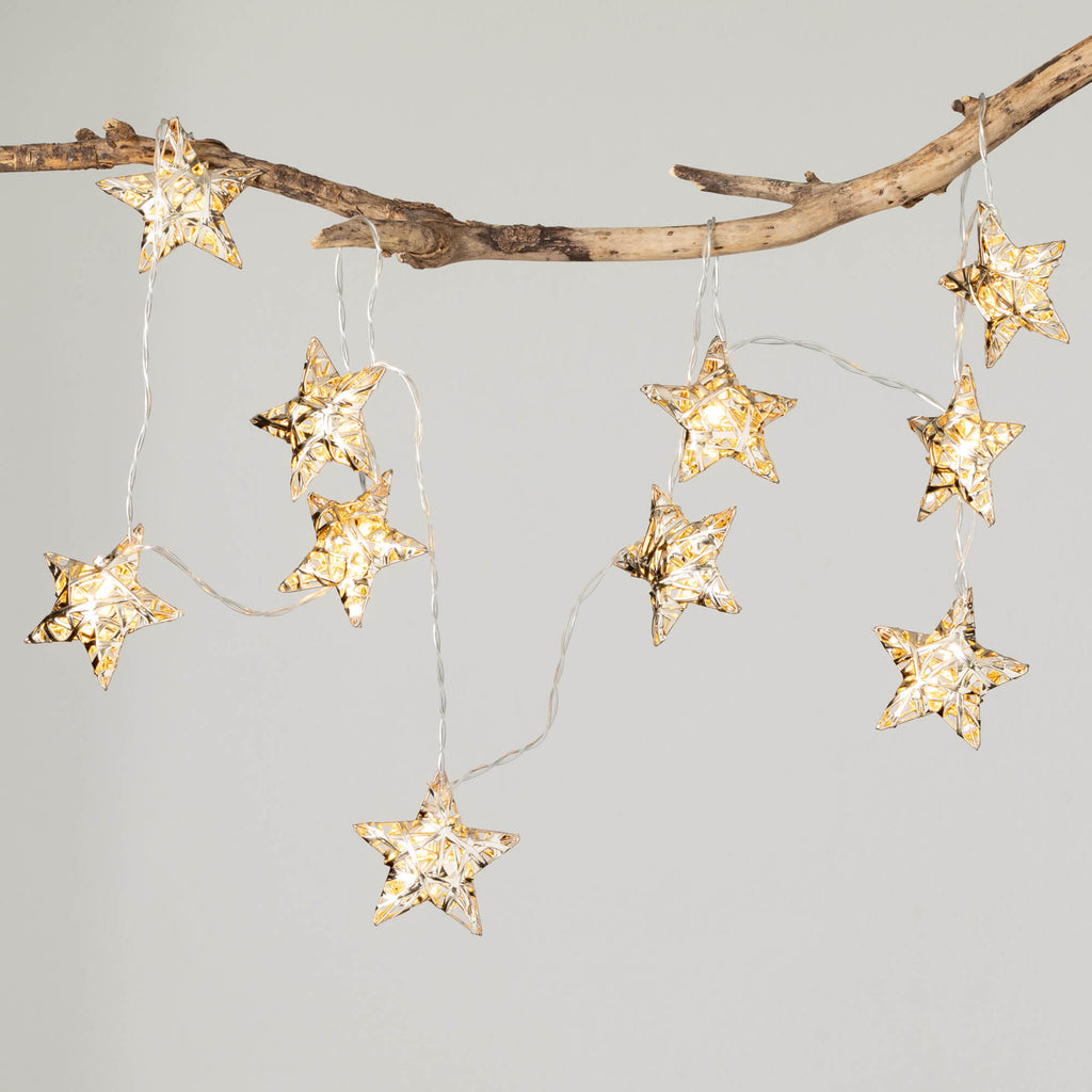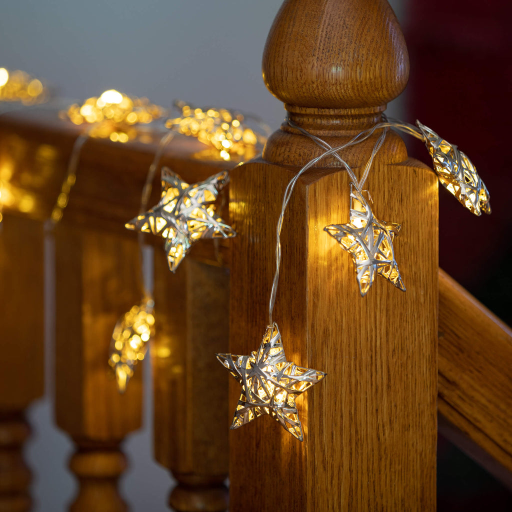 This lighted star garland is the perfect addition to any style of Holiday decor. Featuring warm, white LED lights, this garland includes a timer so you can light up the cold winter nights. Requires 2 AA batteries.