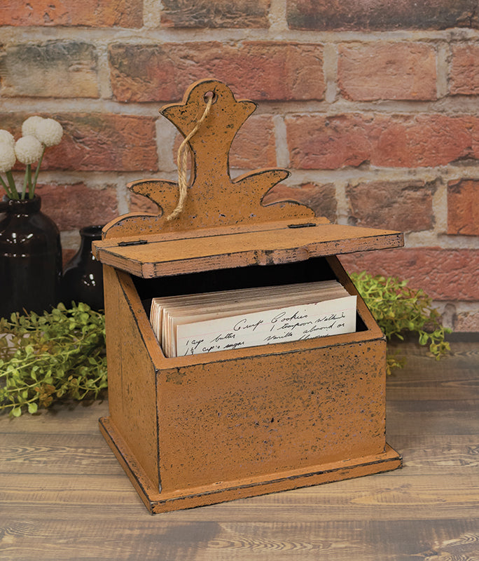 A staple for traditional, country farmhouse decorating, this wooden recipe box is perfect for storing a variety of items. The edges of this rustic container are lightly distressed and the spattered paint surface enhances the vintage look. Includes a hole and a jute cord for the option of hanging on a wall. Measures 12" tall by 8.5" across by 7" deep.