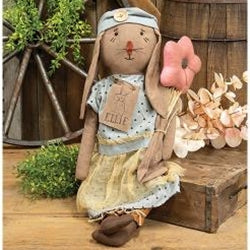 The Ellie Bunny Doll is a decorative primitive plush for the home made of antiquated taupe fabric. The bunny wears a blue patterned dress and yellow apron, completed with a headband, a paper tag reading “Ellie”, and a plush pink flower. This doll has a weighted bottom for a secure sitting display, perfect for placing on a shelf or tabletop during Spring and Easter. Measures 22” high by 8” wide by 3.5” deep.
