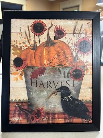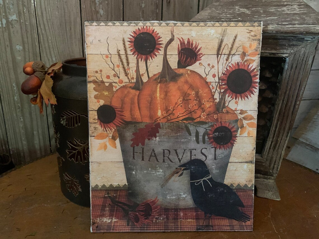 Handmade Vintage ART PRINT Primitive Fall Pumpkin Crow Harvest Bucket Distressed custom FOLKART wall Print on Canvas Board 5x7 or 8x10 Festive flowers with a pumpkin and a crow - perfect print for the Fall holidays. The perfect way to add a bit of whimsy to your seasonal decor! Ideal for adding a smile to your wall, table, or mantle. Give your home the extra touch of warm Fall charm!