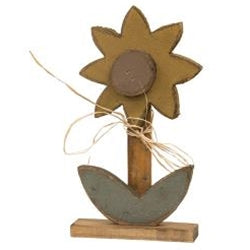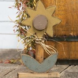 The Rustic Sunflower is a decorative sunflower figurine made of raw, chunky wood. The sunflower is layered, completed with a distressed painted finish, and accented with a raffia straw bow. The bottom of the figurine includes a wooden base for a secure freestanding display, placed sitting on a shelf, tabletop, porch, or hearth, bringing a primitive touch to the home during the Fall season. Measures 14.5” high by 8” wide by 2.25” deep. Made in the USA!