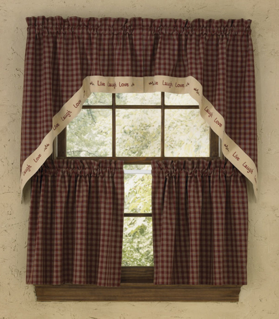 Our Sturbridge Live Lined Valance is the ideal window treatment when trying to introduce something new to your home. Any homeowner would love the traditional plaid of wine and taupe with the attractive bottom which reads "live, laugh, love" which makes it the Sturbridge Live a versatile pattern which is sure to be an eyecatcher in your country home.