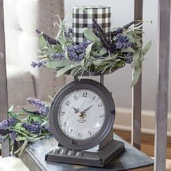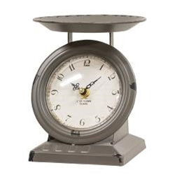 Vintage Dark Gray Old Town Scale Clock is a decorative metal scale with a distressed gray finish. Scale has a classic-style clock built into the front and it requires 1 AA battery (not included) to operate. Clock can also be used to display pillar candles, greenery, or fabric fruits and it measures 6.75" high by 5.5" wide and 5" deep.