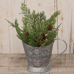 The Western Cedar & Pinecone Pick is a decorative wintertime pick with a flexible, brown-wrapped stem. The pick is filled with textured branches of dark cedar greenery, complete with petite pinecones sprinkled throughout. This pick offers a charming woodland touch to the home, nestled inside of a pitcher, vase, or jar. Measures 14” long.