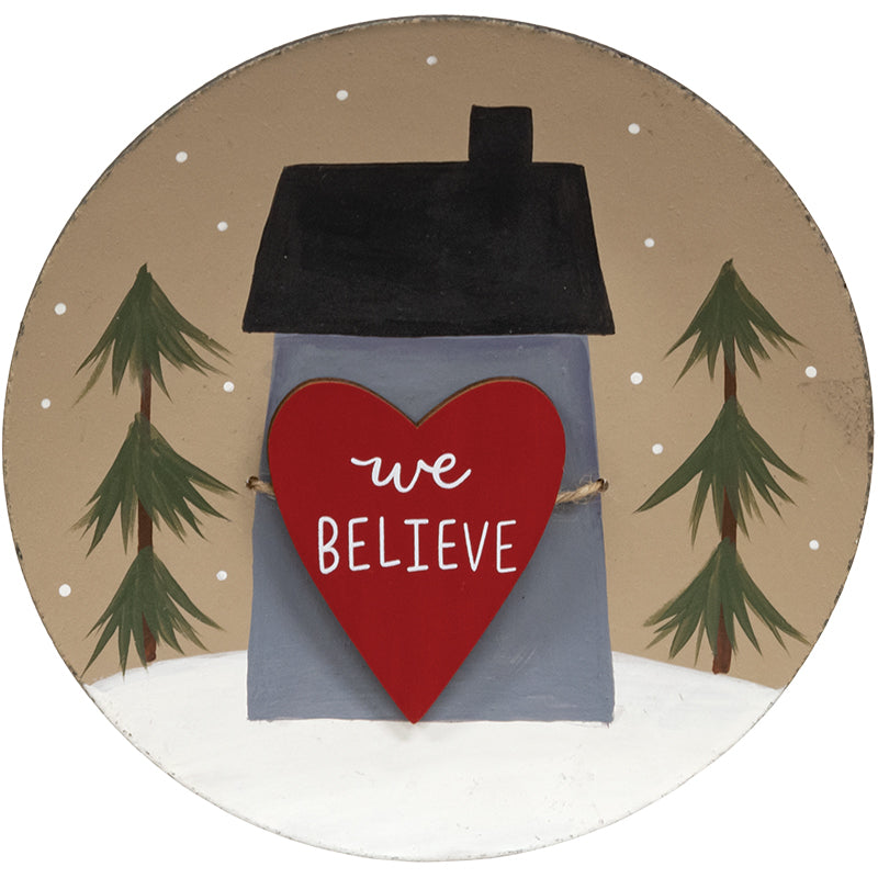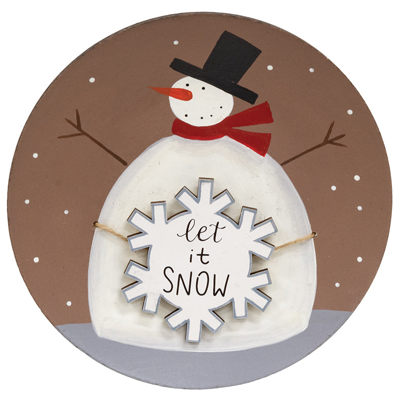 Our wooden Winter Charm Plate comes in an assortment of 3 hand-painted illustrations featuring a cut-out mini sign strung onto jute twine. Includes either a snowman with a snowflake, a house with a heart, or an ornament with a star. Measures 8" across. For decorative use only.