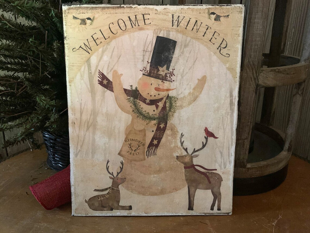Vintage ART PRINT Primitive Welcome Winter Snowman and Friends Christmas FOLKART Distressed wall Decor Print on Canvas Board - 8x10. This whimisical snowman and his reindeer friends will welcome your guests and winter, all at the same time. Remember " Home is Where Your Heart is".